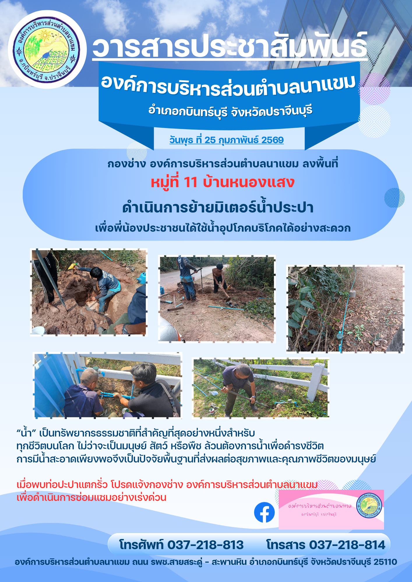 วารสารประชาสัมพันธ์ อบต.นาแขม ดำเนินการย้ายมิเตอร์น้ำประปา เพื่อให้พี่น้องประชาชนได้ใช้น้ำอุปโภคบริโภคได้อย่างสะดวก หมู่ที่ 11 บ้านหนองแสง ในวันที่ 25 กุมภาพันธ์ 2569
